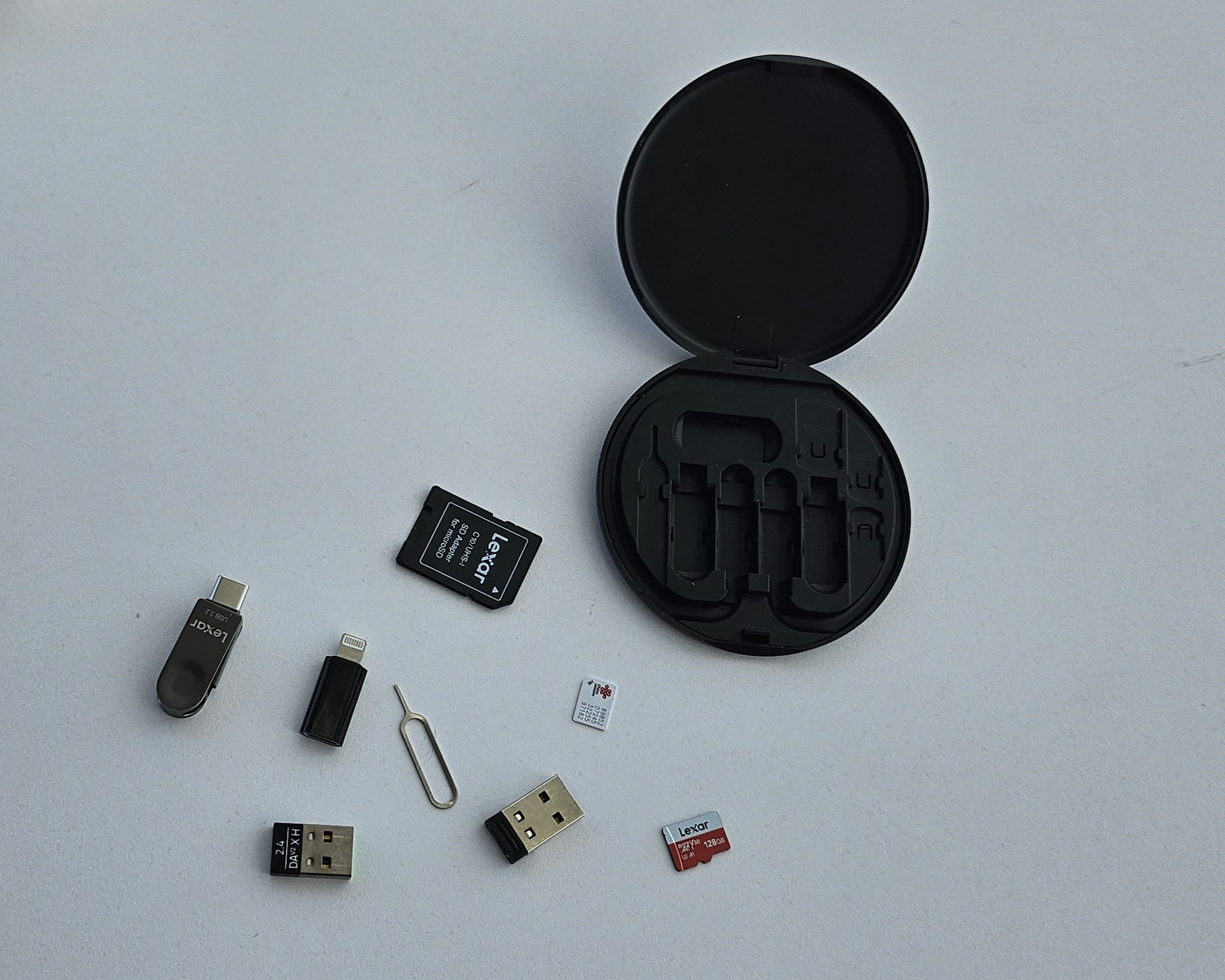 A wallet multitool designed to hold adapters, USBs, and SD cards